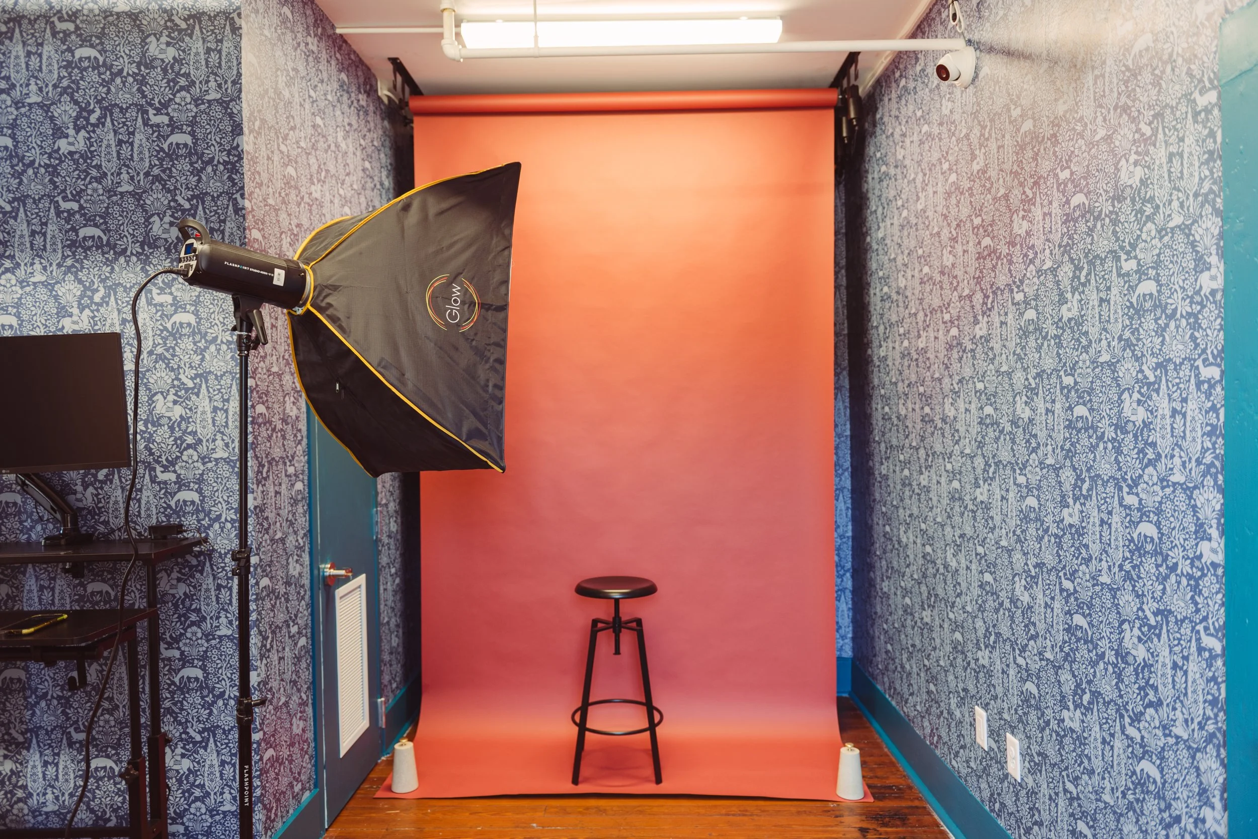 This space is best utilized for portrait sessions- ranging from family photos to graduation portraits, professional headshots and more! The studio is equipped with a monitor, professional lighting, stools, a light-up vanity for touch-ups and multiple colored backdrop options.
