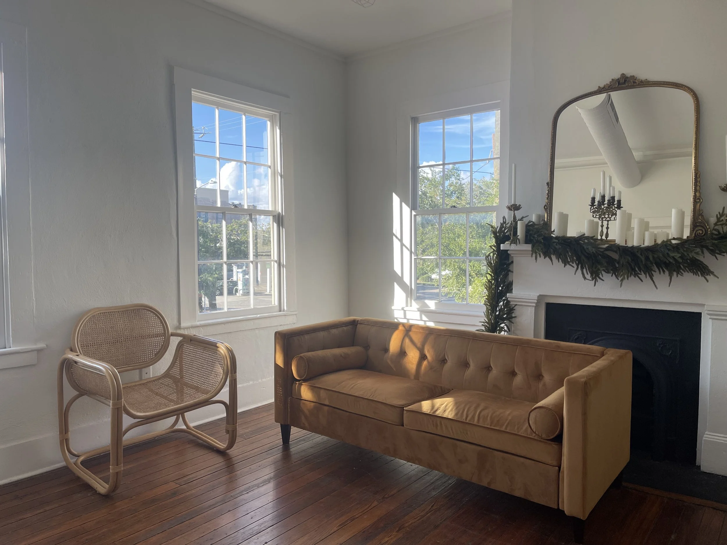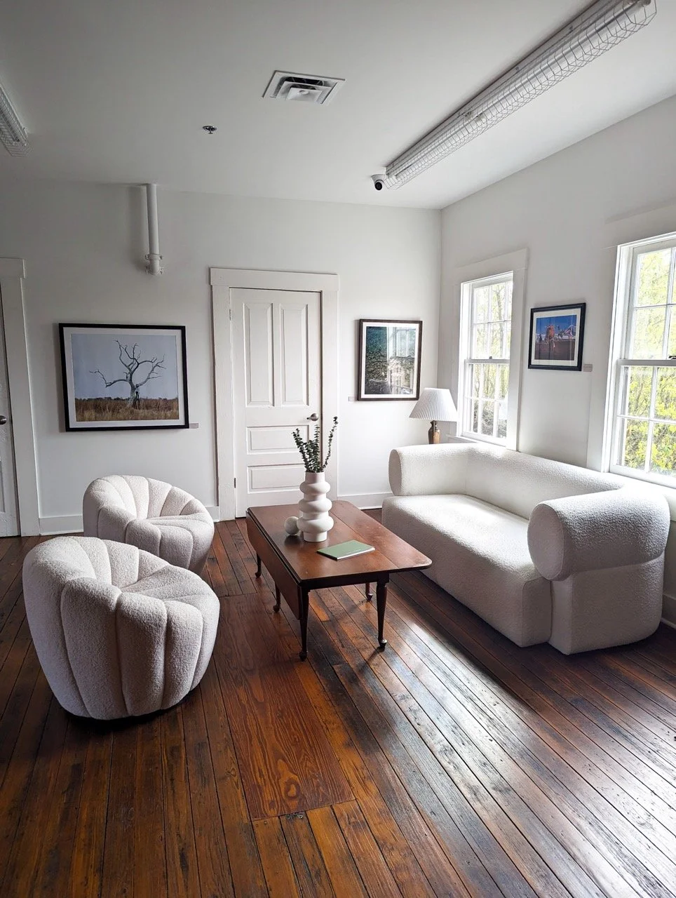 Our studio lives in an old farmhouse that’s been lifted up onto the 2nd story! The space is filled with architectural charm and vintage furnishings.